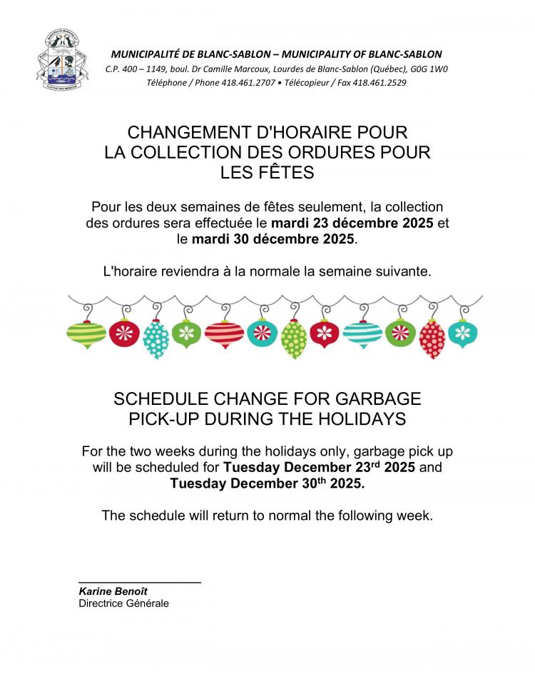 CHANGEMENT D'HORAIRE POUR LA COLLECTION DES ORDURES POUR LES FÊTES 2025