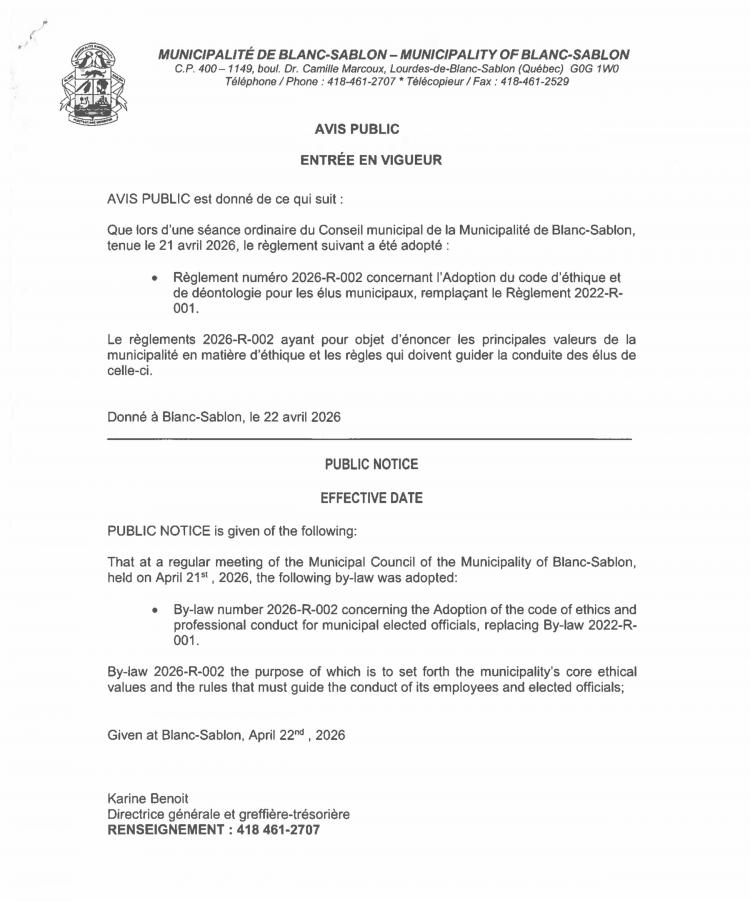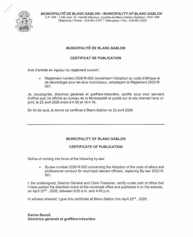 Avis et Certificat de Publication Code d'Éthique