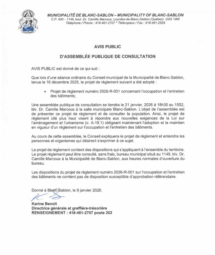 Avis public d'assemblée publique de consultation